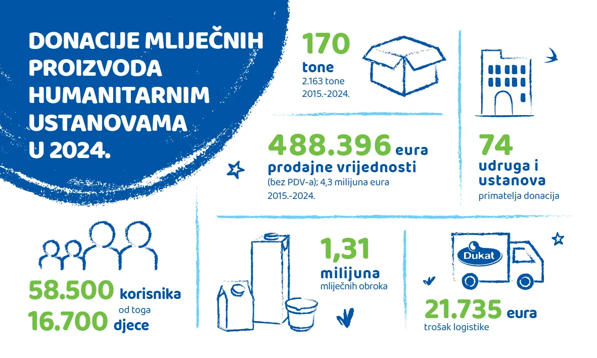 S ciljem smanjenja bacanja hrane te da na taj način pridonesemo smanjenju emisije stakleničkih plinova i borbi protiv siromaštva i gladi, u Dukatu smo 2015. godine pokrenuli sustavni program doniranja hrane. Od tada smo donirali ukupno 2.163 tone mliječnih proizvoda, a samo u 2024. godini 170,4 tona. Svojim programom redovitih donacija u 2024. godini Dukat je za 58.500 djece i građana od Vukovara do Dubrovnika, koji žive u siromaštvu i koji si ih, nažalost, ne mogu sami priuštiti, osigurao 1,31 milijuna mliječnih obroka.